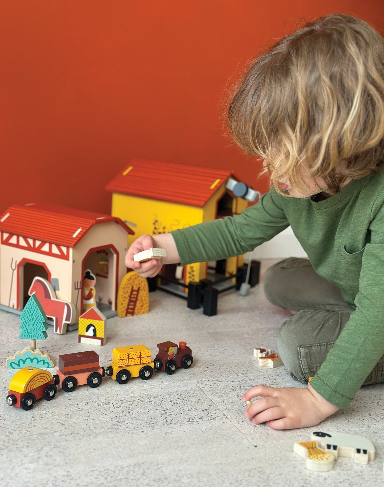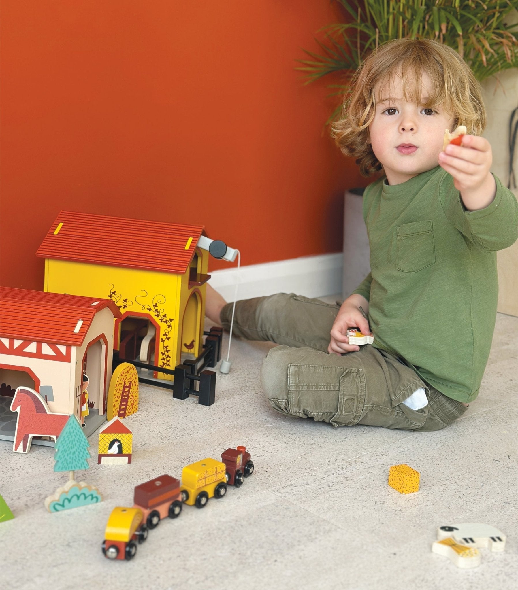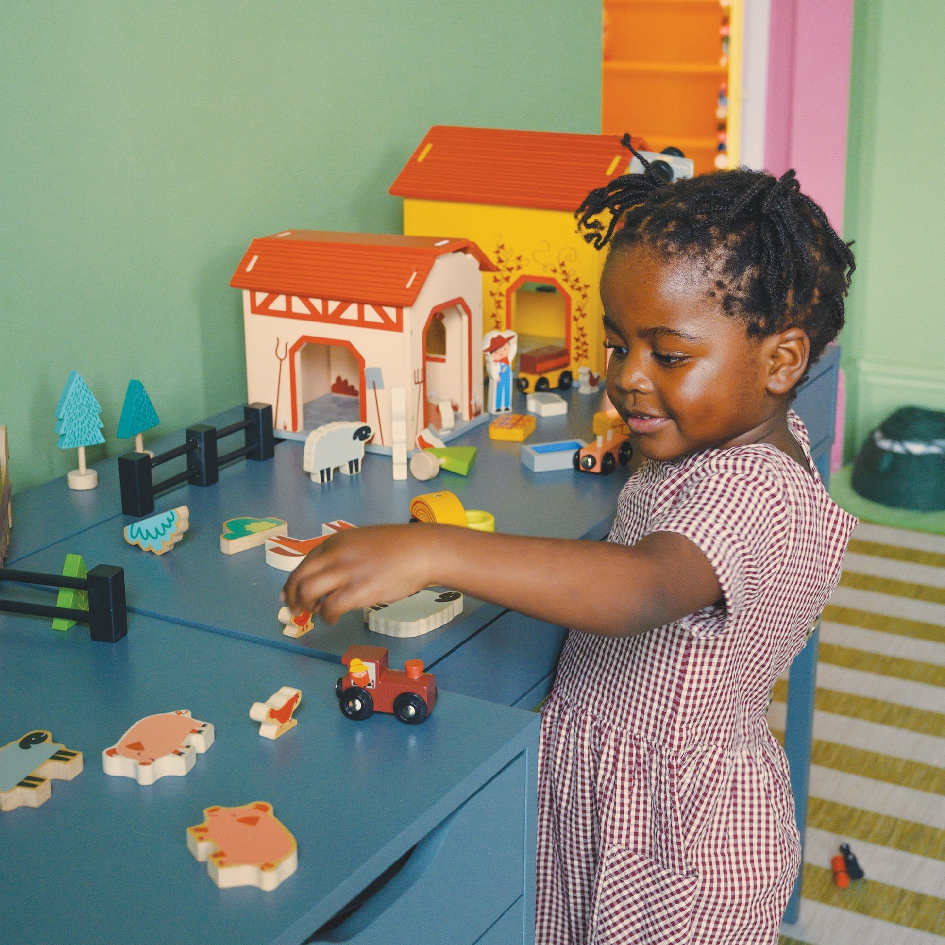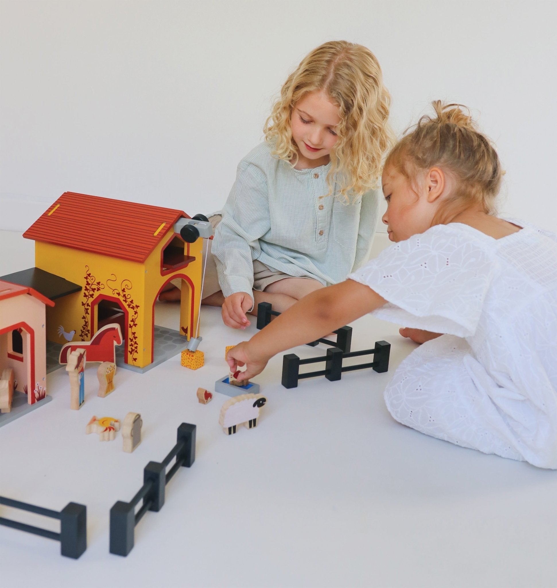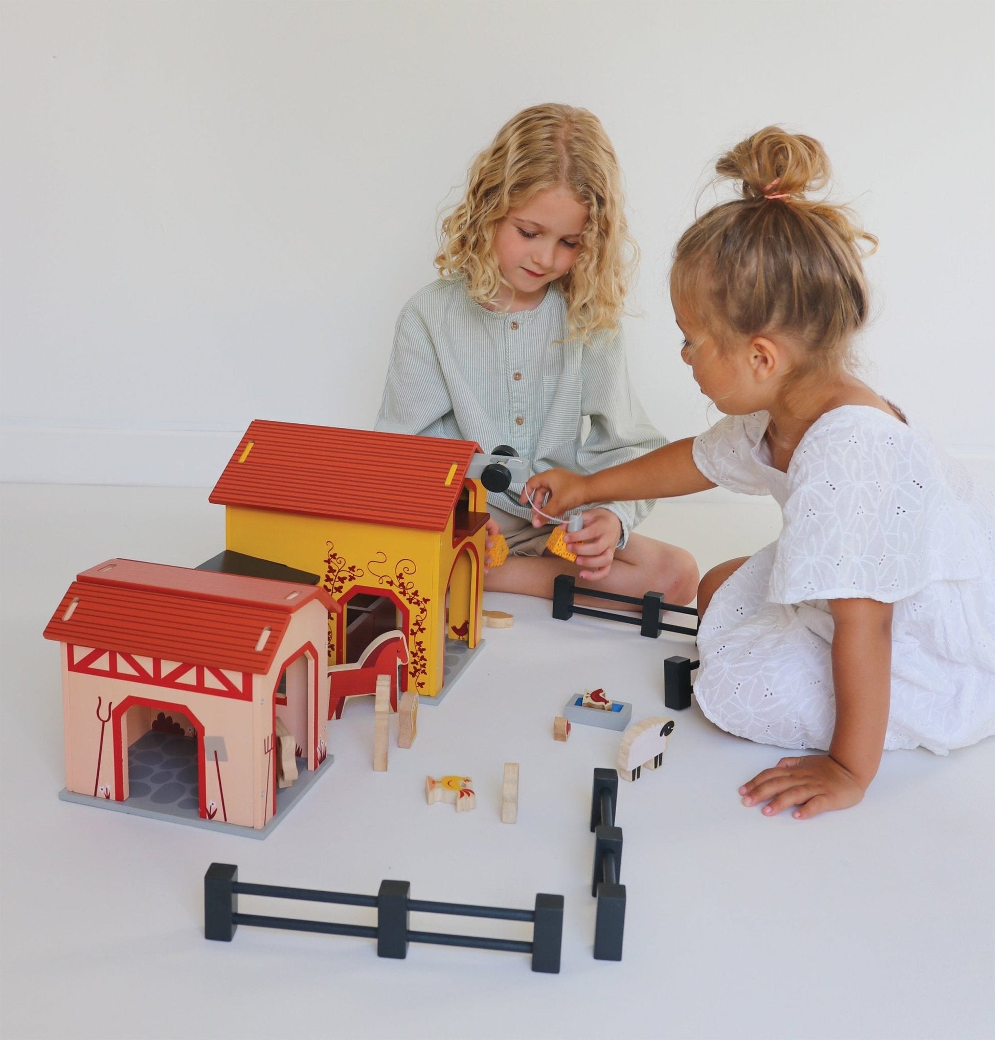 Welcome to Billy's Barnyard, a complete wooden farm world ready for endless rural adventures. This charming set features a barn and stable with working pulley, milking shed, grain store, and fenced pastures. Populate your farm with a horse, sheep, pigs with trough, rooster, hens, hay bales, wheat, and farmer figures. Perfect for little ones who love animals and imaginative storytelling about life on the farm.