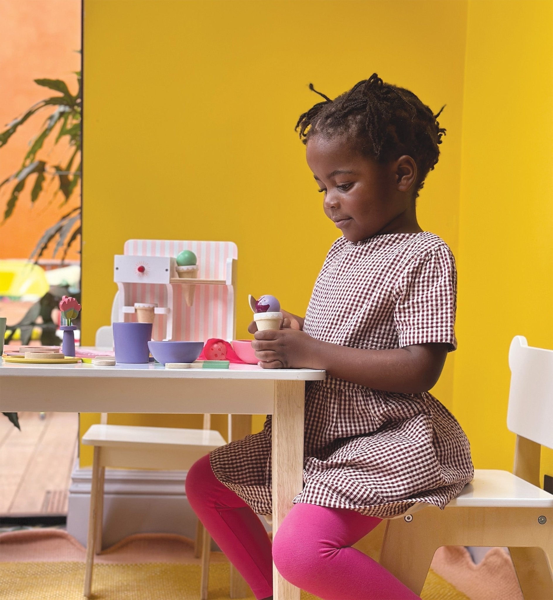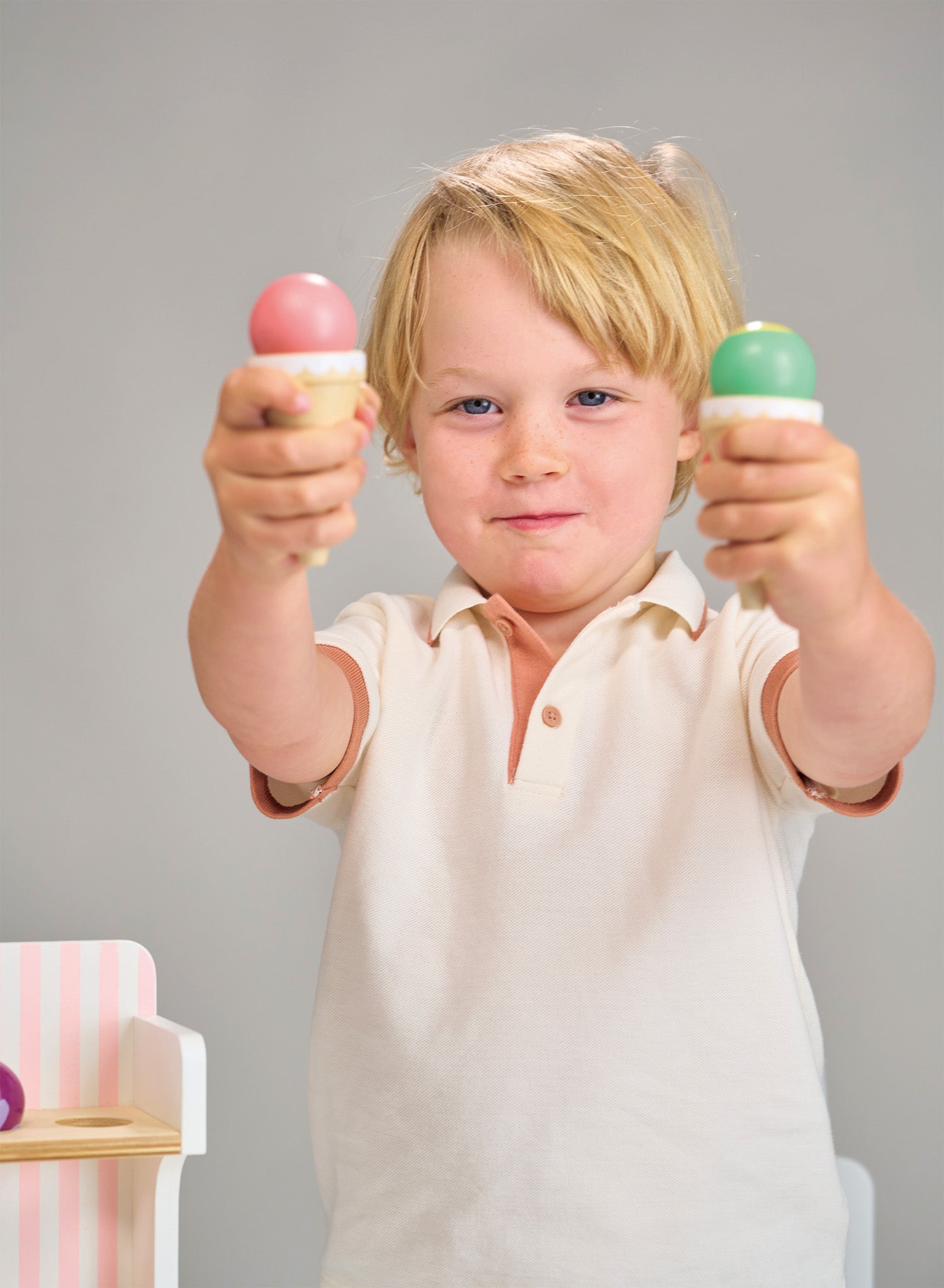 Run your own ice cream stand with this charming wooden kiosk featuring three cones and three scoops ready for mixing and matching. Press the magical red button to watch scoops tumble onto the cones, sparking endless pretend-play scenarios where young shopkeepers craft custom flavors and serve up smiles to imaginary customers.