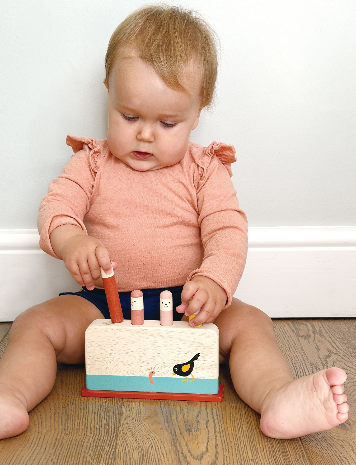Discover three delightful wooden toys in one bundle. Stack colorful rings on the bird-topped tree, pop springy pegs up and down with the Early Bird toy, and tap cheerful toadstools with the bluebird hammer. Each piece builds fine motor skills, hand-eye coordination, and a love of learning through playful woodland-themed fun.